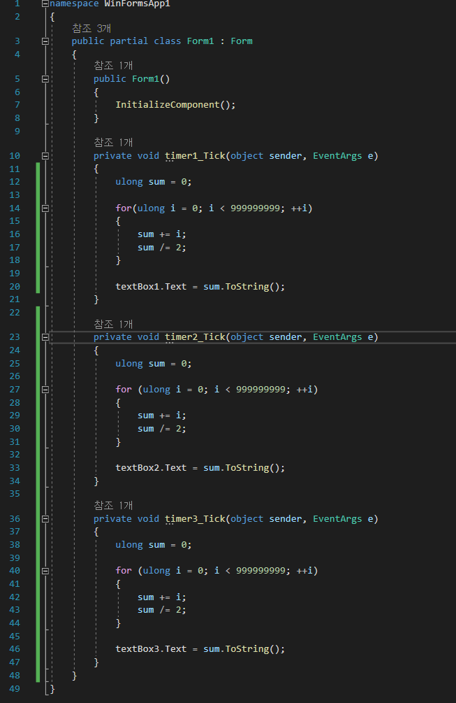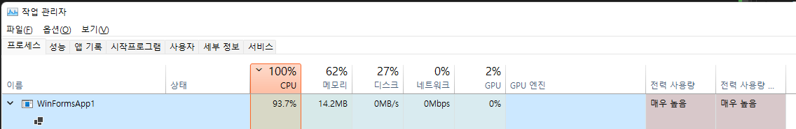 때문에 Forms.Timer 를 여러개 만들어 구동시켜도 CPU 점유율은 일정이상 올라가지 않는다.