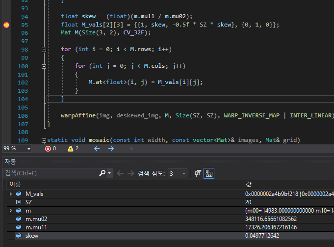 물론 해당 deskew 함수는 해당 코드에서는 '사람이 쓴 기울어진 숫자' 를 똑바로 세우는데 사용되었지만